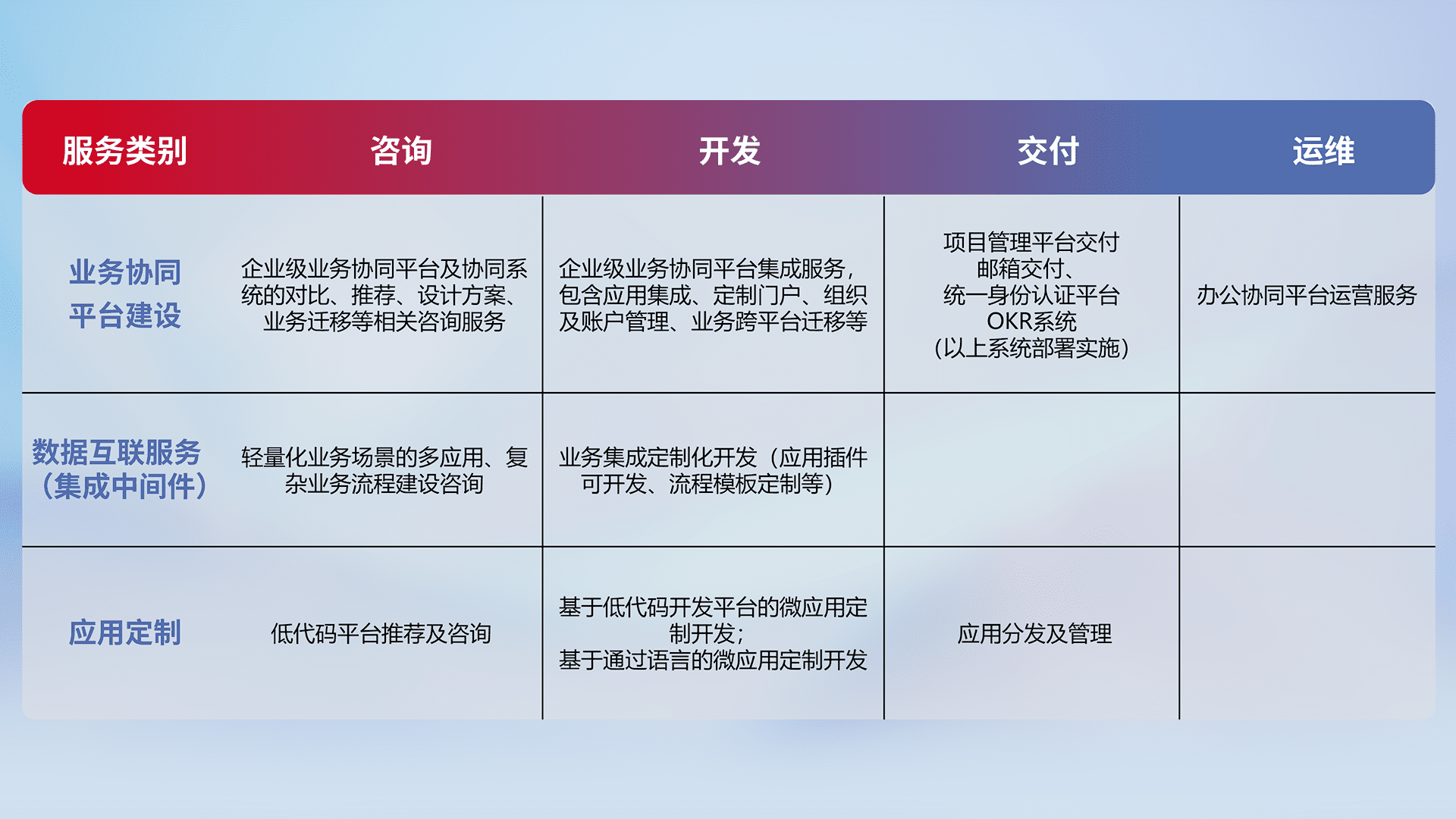 针对钉钉、、、企微、、、、IDaas等平台级产品提供产品的规划、、、方案、、、、交付、、、、定制化开发等服务,,实现如统一协同办公、、、、智能客户服务、、、、混合会议管理、、智能数据查询、、等业务场景,,,,实现数字化转型。。。。